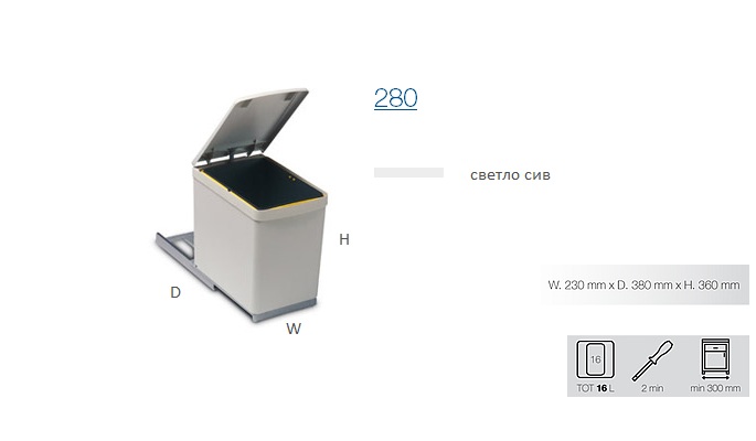 Кош за вграждане с издърпване 280 (шкаф 300) - 16 л.